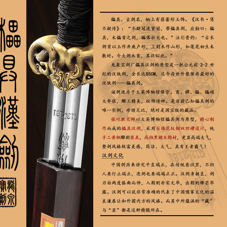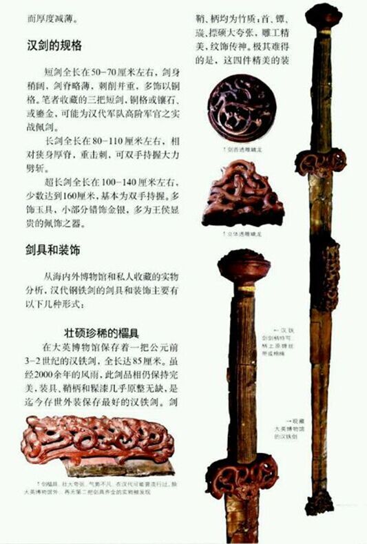 在大英博物馆保存着一把公元前3-2世纪的汉铁剑,全长达85cm,虽然经两千余年的风雨,此剑品相仍保持完美。装具、鞘柄和髹漆几乎完整无缺,是迄今存世外装保存最好的汉铁剑。剑鞘、柄均为竹制。首、镡、櫑、櫑硕大夸张,雕工精美,纹饰传神。极其难得的是,这四件精美的装具完全为木雕,在汉武帝时,称作“櫑具剑”。( 櫑lěi〔~具〕古代长剑,木柄上镶有蓓蕾形的玉饰)《汉书·隽不疑传》“不疑冠进贤冠,带櫑具剑,应勋曰:櫑具,木櫑首之剑,櫑落壮大也。”这把汉剑与《汉书》的记载完全符合,亦是目前已知櫑具剑的唯一实例,珍惜无比,绝对是国宝级的藏品。
