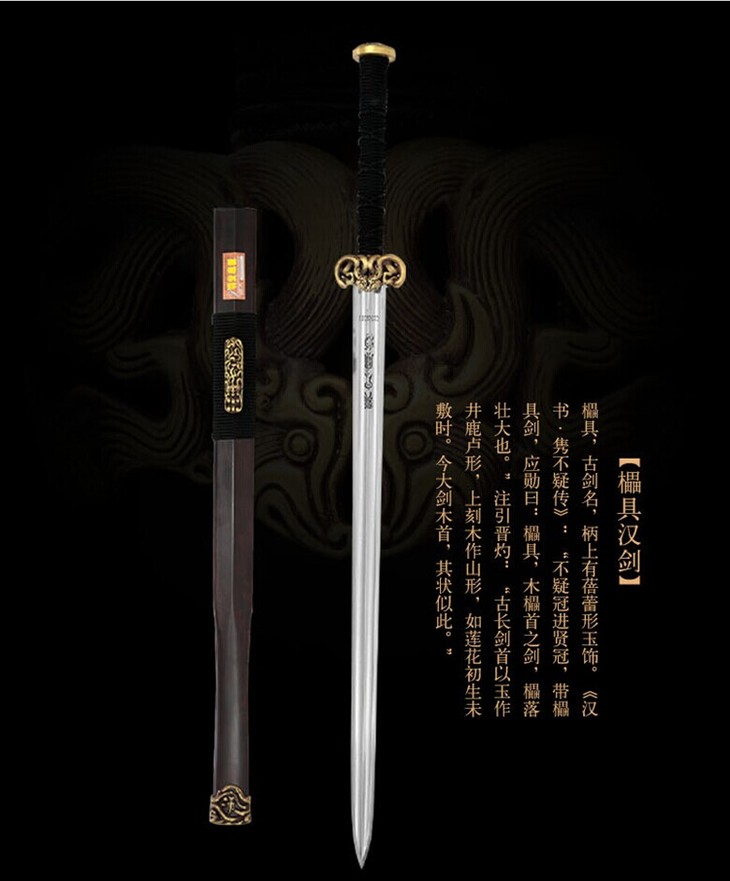 汉剑,即是兴盛于汉代的钢铁剑。由于汉代冶铁业的发展突破了青铜剑的长度限制,汉剑剑体日益轻薄窄长且剑锋更尖锐,东汉时期钢铁剑彻底取代青铜剑。作为最后的战场使用剑,汉剑在中国刀剑历史上占有不可替代的地位。具体形制参照博物馆里的汉代出土文物,通常一米一以下以单手剑为主流,一米二以上则双手为主。其本身设计就体现着秦汉时期粗犷大气的风格,平直的剑身是为正气,狭长的剑刃是为霸气。