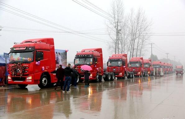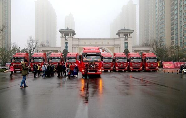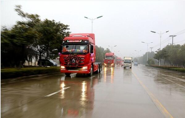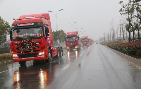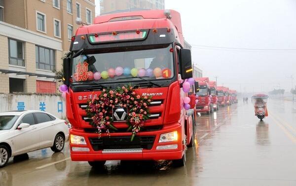吉时一到,十台大红色的徐工漢风重卡用鲜花气球装饰,依次出发,在公路上形成一列别样的红色风景,颇为壮观。