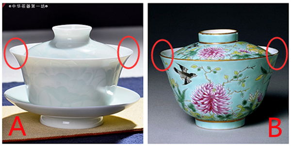 B图反口幅度较小的盖碗,盖子与口沿之间没有太多余地,手指会碰到碗身,热度相对就大了,这样就比较烫手。