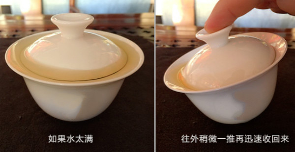 2、如果茶水满出盖碗,可以按住盖子,轻轻将整个盖碗往外推一下收回来,盖碗倾斜,满过盖碗的茶水自然就留走了,再拿起盖碗也就不那么烫。