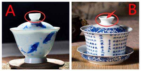 B图盖子的盖钮是凹进入的,盖纽离盖子的面较短,冲泡茶叶时,热气不断向上冒,盖子下面的温度肯定就很高,我们手指按在上面,自然会更烫。