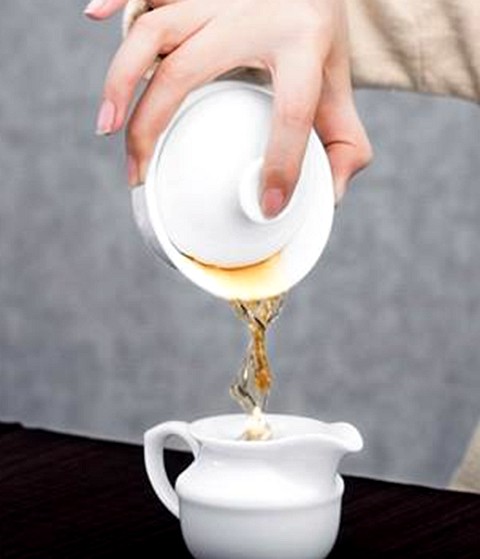3、倒茶时盖碗要拿正,沿着公道杯慢慢向下让茶水缓缓流出,茶水就不容易触碰到手。