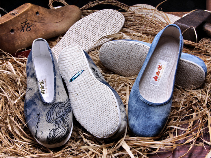 水墨小元男鞋/海之蓝女鞋,均采用亚麻鞋面,纯棉布鞋里,千层布底,适宜春夏秋穿着,采用传统反绱工艺,做工精细,用料考究