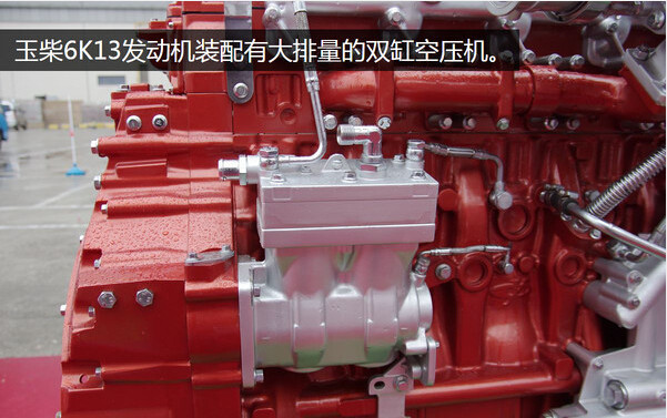 目前的卡车采用气囊悬挂的车型越来越多,对压缩空气的需求量也越来越大,单缸小排量的空压机已经不能满足需要,所以玉柴6K13这款发动机直接采用的是双缸的大排量空压机,足以满足空气悬挂和制动系统大量的压缩空气需求。