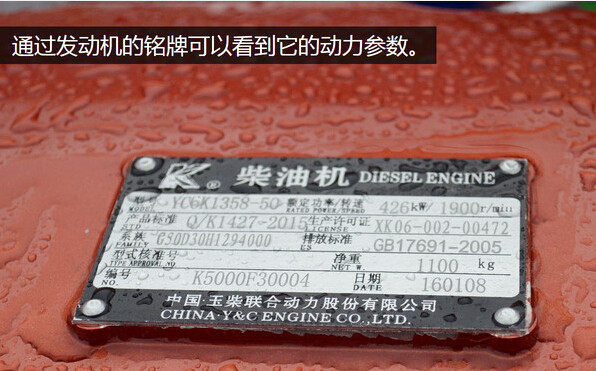 这款发动机的型号为YC6K1358-50,其中YC是玉柴的缩写,6K代表机型系列,13代表这款发动机为13升排量,58代表580马力,最后的50代表这台发动机符合国五排放标准。