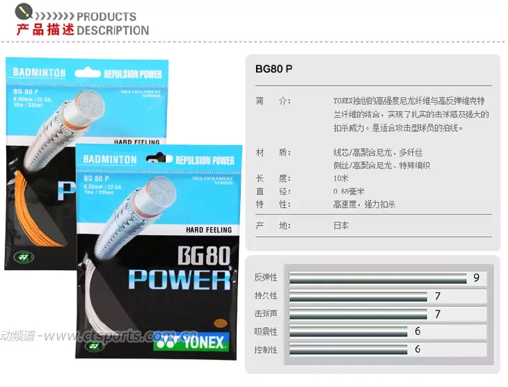 个人用后感:一直是我的爱线,从以前到现在。由于我喜欢双打后场杀球,每次杀球,那种感觉就像可以把球压扁一样,如果正中红心,那个速度真的和子弹一样。缺点是虽然都是0.68mm,但是80p比80容易断,原因我也不清楚。 80p和我的vtzf配合简直就是天生一对,力量和硬邦邦的手感,真的非常适合暴力杀球选手使用。