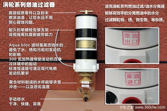 【卡车之家 原创】目前国内部分区域柴油,品质差距较大,电喷高压共轨等柴油机的燃油喷射系统,对柴油品质要求较高。派克Parker Racor涡轮系列燃油过滤/油水分离器,能够高效率的分离燃油中的水分,过滤颗粒物、锈、微生物、等杂质。