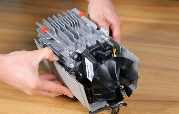 出风口的端盖拆下之后,轻轻抬起上盖,连同进风口的端盖就一起被拆掉了。主机的上半部分全部展露出来,可以看到不同颜色的连接线、被完全包裹的电路面板、径流风扇、电机以及散热体。整个散热体相当于主机大小的2/3,在散热体四角的鳍片上还设有橡胶垫片,以防金属散热体与外壳硬接触。