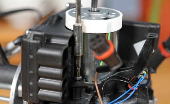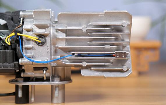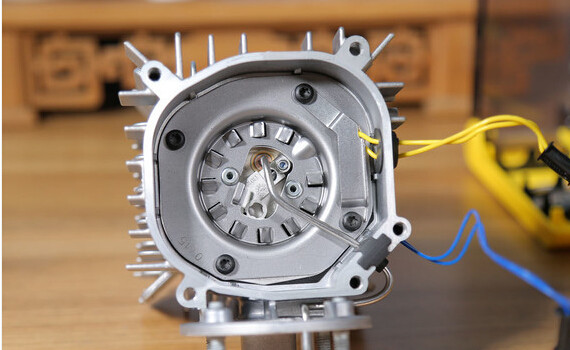 电路板拆掉之后,在电机的表面可以看到相关的参数以及清楚的标明Made In Germany德国制造的标识。电机与散热体是通过五颗黑色的六花螺丝连接在一起的,在拆解的时候发现这五颗螺丝非常紧,开始我们只是手握螺丝刀根本拧不动,后来又借助了钳子但还是无法打开,最后我们利用了活口板子才搞定,可见燃烧室的密闭性还是不错的。