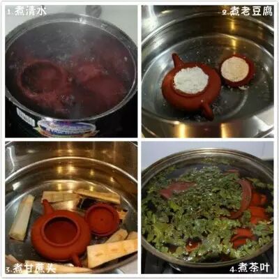 将白水煮过的壶与一块老豆腐,一同放入清水中去煮,方法同上,至少一个小时。这个步骤叫做去火气,目的是为了褪掉制壶时高温煅烧带来的火气。