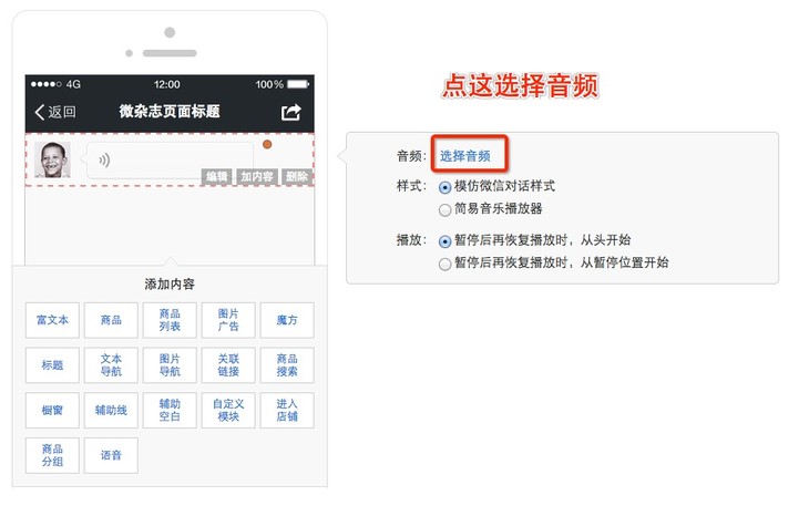 4. 在微杂志里,选择音频时,就可以直接选择插入这条语音