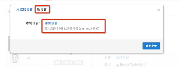 现在上传音频,只支持.amr和.MP3格式的文件,最大不超过6M
