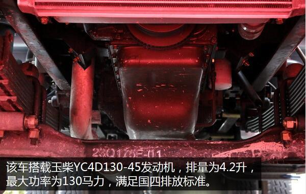 底盘方面,该车搭载玉柴YC4D130-45发动机,排量为4.2升,在轻卡中已经属于大排量了,最大功率为130马力,满足国四排放标准,强大的动力给拉重货充满信心,行业中也有干重载用玉柴的说法,所以这台发动机给这台6米车一个很好的定位。