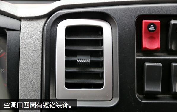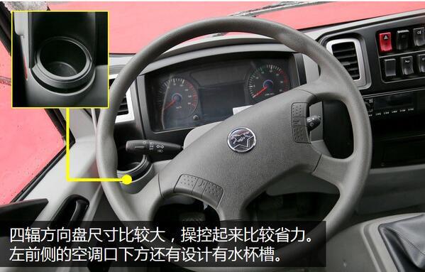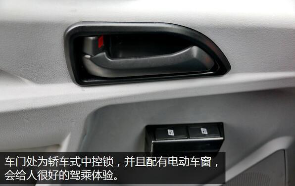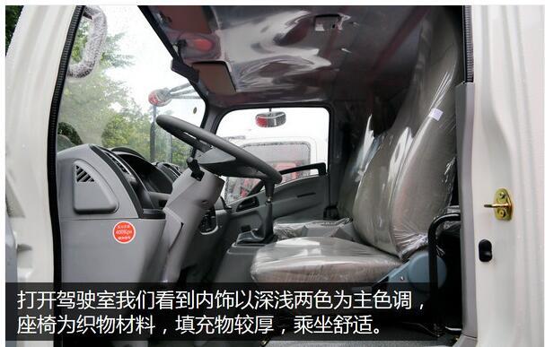 打开驾驶室我们看到内饰以深浅两色为主色调,座椅为织物材料,填充物较厚,乘坐舒适,可以调节。车身宽度为2080mm,内部空间比较大,活动自如。车门处为轿车式中控锁,并且配有电动车窗,会给人很好的驾乘体验。