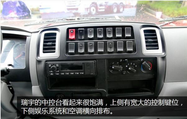 瑞宇的中控台看起来很饱满,空调口四周有镀铬装饰,上侧有宽大的控制键位十分霸气,并预留了改装键位。下侧娱乐系统和空调横向排布,娱乐系统键位较小与上侧按键形成了反差。空调的控制按钮离驾驶员较远,操控起来可能会有些不方便。