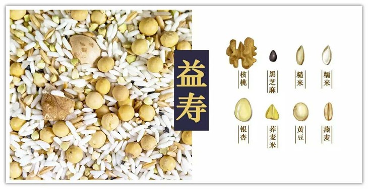 配料:银杏、荞麦米、燕麦、黑芝麻、黄豆、糯米、糙米、核桃。
