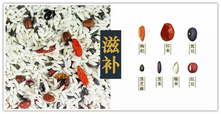 配料:红枣、枸杞、黑米、黑豆、黑芝麻、红豆、糯米。