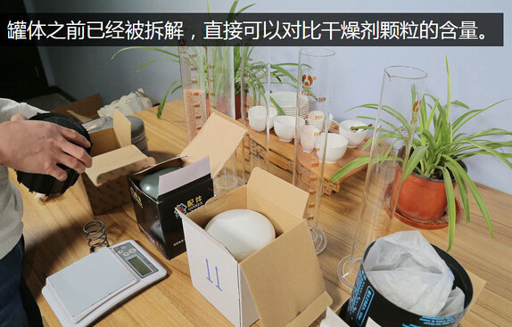 由于这四款产品之前已经被拆解了,所以本次对比就省去了拆解的过程,可以直接进行比较。首先先把产品摆开,并且把之前拆解出来的干燥剂颗粒装到量筒里,以便于大家更直观的看到它们的体积差异。