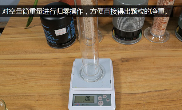 首先对空量筒进行称重和归零操作,这样可以直接得到颗粒的净重,不需要再减去量筒的重量,比较方便和简单。