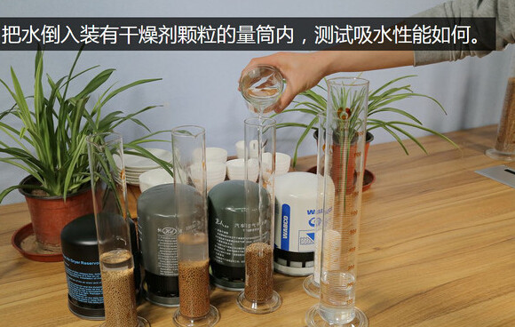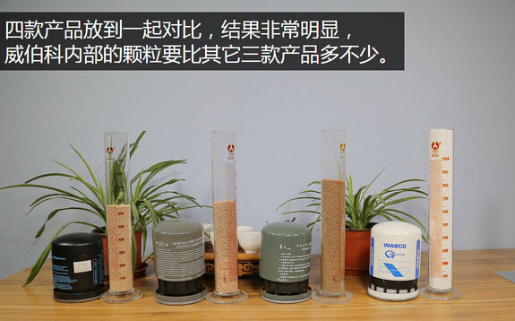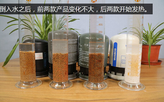 这四款产品的干燥剂颗粒已经全部被装到了量筒里,从左到右依次为无名产品、体积640立方厘米,恒顿牌690立方厘米,冒牌“重汽亲人”870立方厘米,威伯科白罐1240立方厘米。从这可以看出来,劣质产品和优质产品在干燥剂数量方面是差很多的。