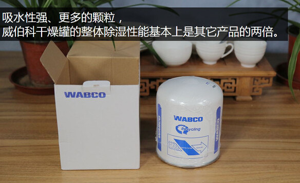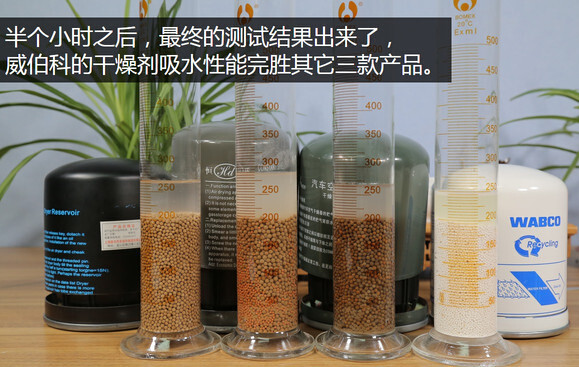通过上边的测试,我们知道威伯科的干燥剂颗粒吸水性比其它三款产品强不少,而且最重要的是罐体内的颗粒比它们还多,所以整体计算下来威伯科的干燥罐吸水性达到了最差产品,也就是恒顿牌的2.6倍、假冒重汽亲人牌的1.7倍,除湿性能非常强。