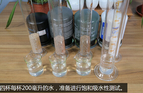 在静置了半个小时之后,最终的吸水性能结果出来了,从左至右第一款无名产品,量筒水位刻度265mL,第二款恒顿牌达到了290mL,第三款冒牌重汽亲人270mL,第四款威伯科白罐240-245mL之间,可以看出来威伯科白罐的颗粒吸水性明显要比其它三款产品强很多。有意思的是,这个结果正好印证了之前进行的颗粒比重测试,越轻的颗粒吸水性越强,反之就越差。