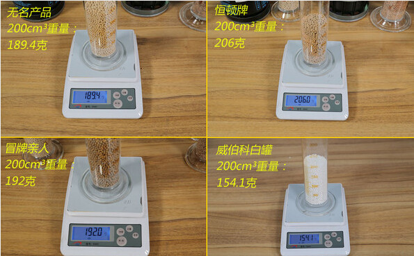经过称重,无名干燥罐200立方厘米体积的干燥剂颗粒净重为189.4g,恒盾牌206g,冒牌重汽亲人192g,威伯科白罐154.1g。通过这可以看出来,威伯科白罐的干燥剂颗粒比重要比其它三款产品轻很多。
