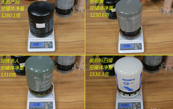 对比完了干燥剂颗粒的总量,我还要对失去了干燥剂的罐体进行重量对比,这样可以更直观的判断出产品的用料是否厚道。经过称重,无名产品为1280.1g,恒盾牌1238.6g,假冒亲人1310g,重汽亲人1530.3g。
