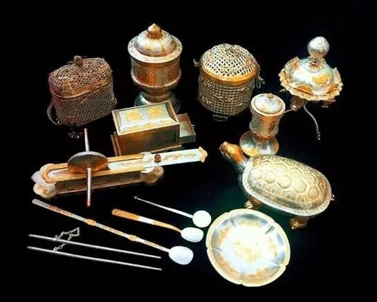1987年,考古学家从法门寺地宫中发现了历史上第一套“发烧级唐代宫廷茶具套装”,以金银、玻璃器皿为主,其专业度和精美度令人赞叹。(见下图)