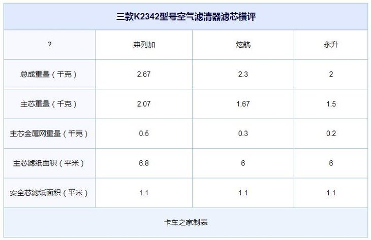 我们本次横评的三款商用车空滤产品型号均是K2342,品牌分别是弗列加、炫航和永升,价格由高到低依次为115元、50元和35元不等。卡车之家将从产品重量、细节做工、粘结剂强度、滤纸面积等方面进行横向对比测试。