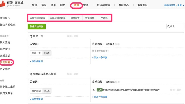 有赞后台菜单—微信—自动回复设置找到配置入口