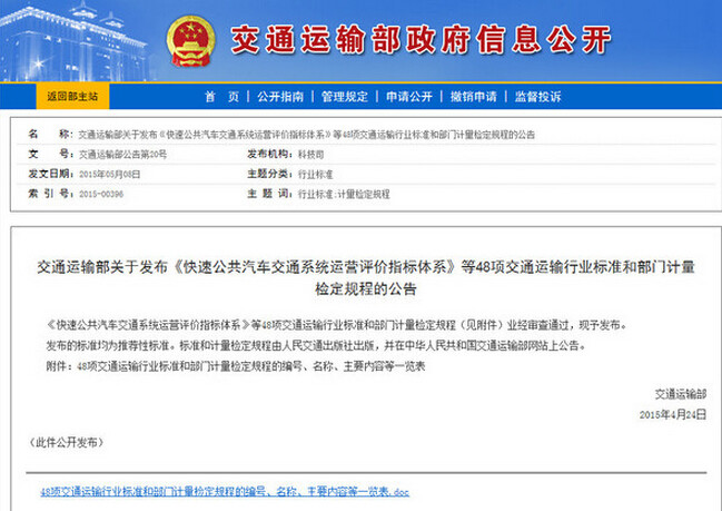 2015年5月8日,交通运输部官网发布“《快速公共汽车交通系统运营评价指标体系》等48项交通运输行业标准和部门计量检定规程“的公告,在其中的第4项,关于尾板加装的相关规定赫然在列。(交通运输部公告原文:http://www.moc.gov.cn/zfxxgk/bnssj/kjs/201505/t20150508_1814650.html)