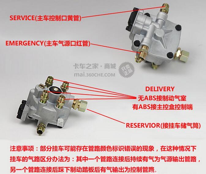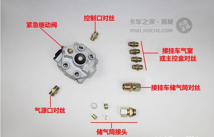 2、当出现供气回路断裂这种紧急情况,紧急继动阀的动作将引起挂车自动制动。