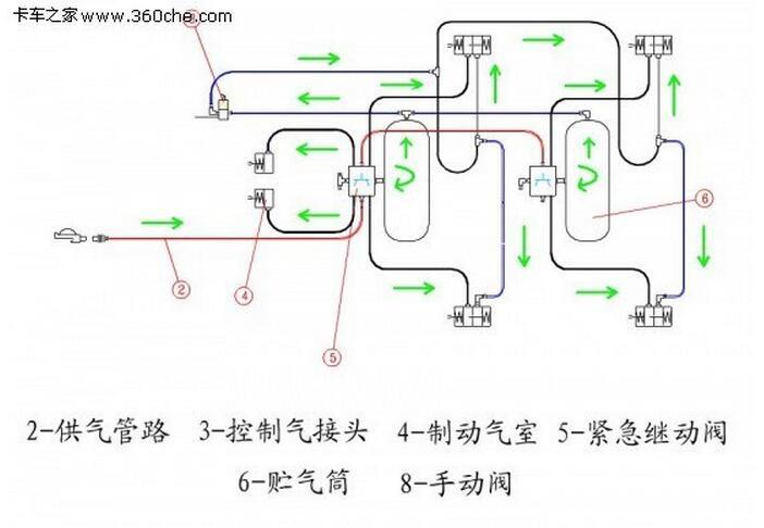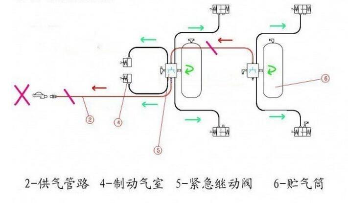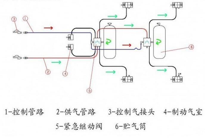 这是我们感受最直接的功能,踩下制动踏板时,控制管路①送气,紧急继动阀⑤控制⑥储气筒给④制动分泵供气产生制动力;当松开制动踏板,紧急继动阀快速释放各分泵压缩空气,迅速解除制动状态。