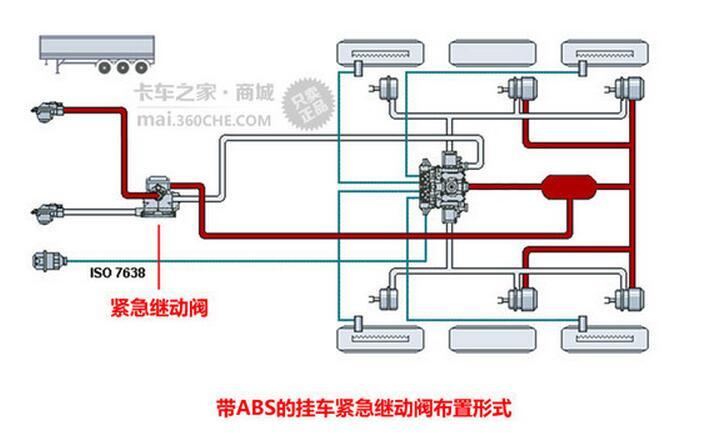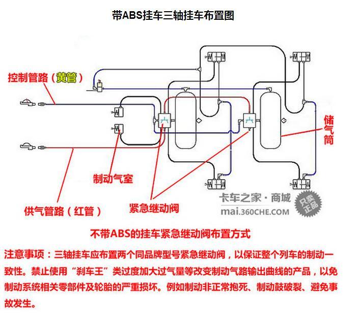 1、三轴挂车应布置两个同品牌型号紧急继动阀,以保证整个列车的制动一致性。