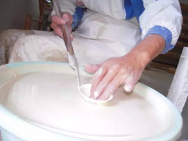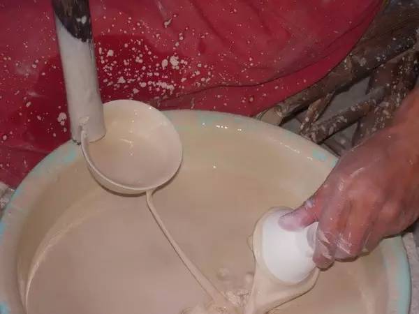圆器制作,若是器内没有装饰的,则需要先上里釉。器物外面的釉则是后期第二次的浸釉。釉,是附着在陶瓷坯体表面的玻璃质薄层,与玻璃有着类似的物理和化学性质。釉一般以石英、长石、粘土等为原料。陶瓷施釉的方法有:喷、吹、浸、浇、荡等方法。里釉(器物内部的釉面)和底釉(器物底足的釉面)我们采用的是传统的荡釉法,外釉我们采用浸釉法。