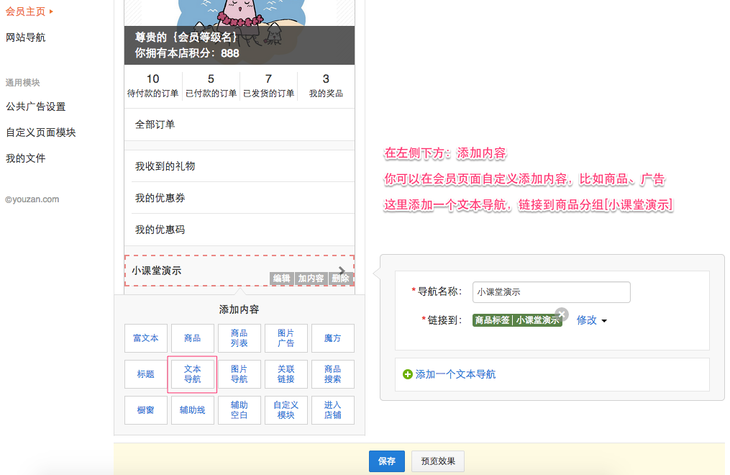 2 在会员页面添加自定义内容:我们有丰富的自定义组件,你可以自由添加自己想要的内容,如添加一款你强推的商品,增强其曝光率