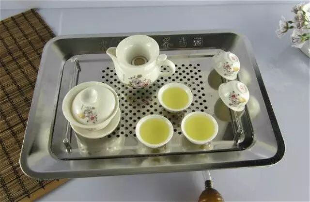 金属茶盘最以实用见长,若非外力恶意破坏,永远不会开裂,兼价格便宜,所以用者甚广。不锈钢茶盘长久不清洗而蒙茶垢,略经擦拭即可光亮如新,只是这西洋光很是有些舶来品的感觉,不如其它材制更见中国味道,但在闽地安溪,经营铁观音的茶商多喜此物,家家必备,亮晶晶的一字排开,颇为壮观。