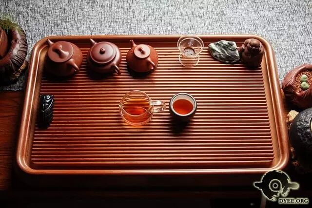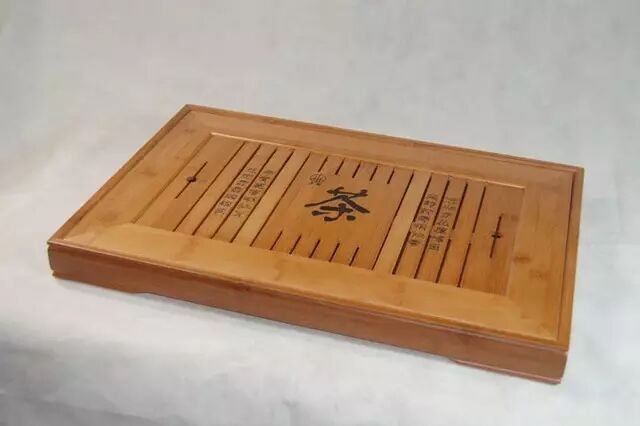 茶盘就是盛放茶壶、茶杯、茶道组、茶宠乃至茶食的浅底器皿;它可以很大,也可以很小;也有各种款式,可方可圆或作扇形;可以是单层也可以是夹层,单层以一根塑料管连接,排出盘面废水,但茶桌下仍需要一桶相承;夹层用以盛废水,可以是抽屉式的,也可以是嵌入式;其选材广泛,金、木、竹、陶皆可取。以金属茶盘最为简便耐用,以竹制茶盘最为清雅相宜,此外还有檀木茶盘、石头茶盘、陶瓷茶盘等。